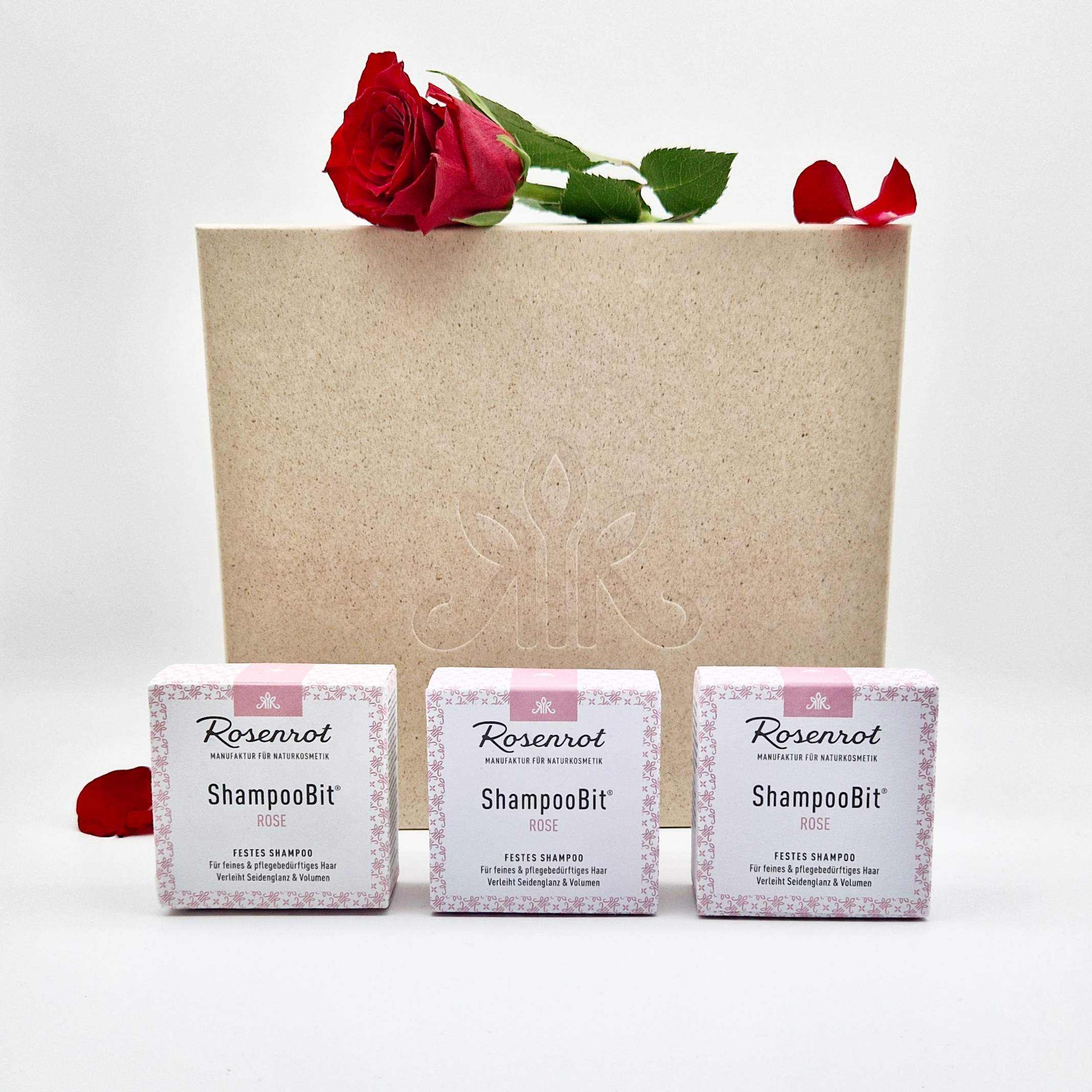 3x ShampooBit® – Rose – 55g - Mit wertvollem Bio-Rosenblüten-Extrakt, pflegender Bio-Kakaobutter und Bio-Sheabutter. Gibt normalem bis feinem Haar die besondere, vitalisierende Pflege. Zaubert Seidenglanz und sorgt für volles Haar. Mit dem sinnlichen Duft wilder Rosen.